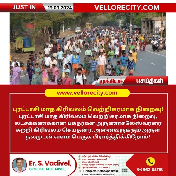புரட்டாசி மாத கிரிவலம் வெற்றிகரமாக நிறைவு, லட்சக்கணக்கான பக்தர்கள் அருணாசலேஸ்வரரை சுற்றி கிரிவலம் செய்தனர். அனைவருக்கும் அருள் நலமுடன் வளம் பெருக பிரார்த்திக்கிறோம். 1,314
