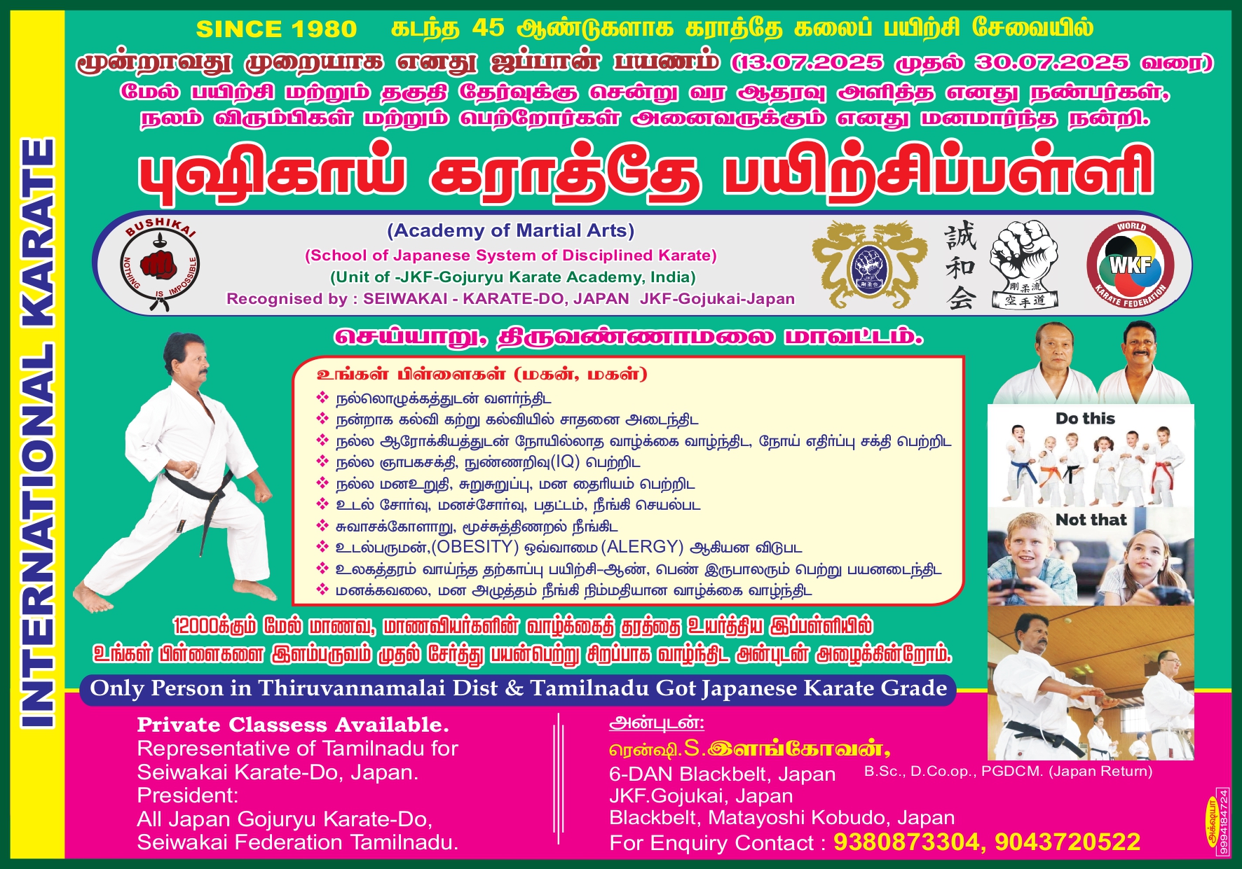 45 ஆண்டுகளாக கராத்தே தற்காப்பு கலைக்காக அர்ப்பணித்து செயல்பட்டு வரும் புஷிகாய் கராத்தே பயிற்சிபள்ளியின் நிறுவனர் திரு S.இளங்கோவன், கடந்த மாதம் (13.07.2025 முதல் 30.07.2025 வரை) மூன்றாவது முறையாக ஜப்பான் பயணம் செய்து மேம்பட்ட பயிற்சி மற்றும் தகுதி தேர்வில் கலந்து கொண்டார்.