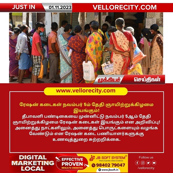 தீபாவளி பண்டிகையை முன்னிட்டு நவம்பர் 5ஆம் தேதி ஞாயிற்றுக்கிழமை ரேஷன் கடைகள் இயங்கும்!