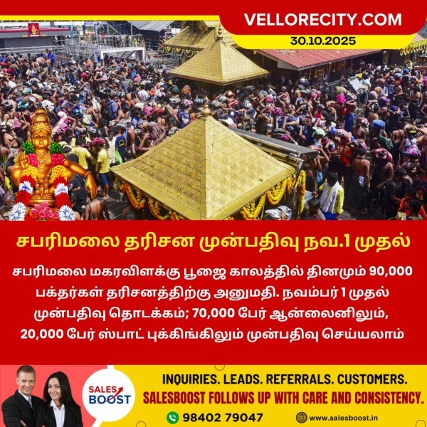 சபரிமலை மகரவிளக்கு பூஜை காலத்தில் தினமும் 90,000 பக்தர்கள் தரிசனத்திற்கு அனுமதி. நவம்பர் 1 முதல் முன்பதிவு தொடக்கம். 70,000 பேர் ஆன்லைனிலும், 20,000 பேர் ஸ்பாட் புக்கிங்கிலும் முன்பதிவு செய்யலாம்.