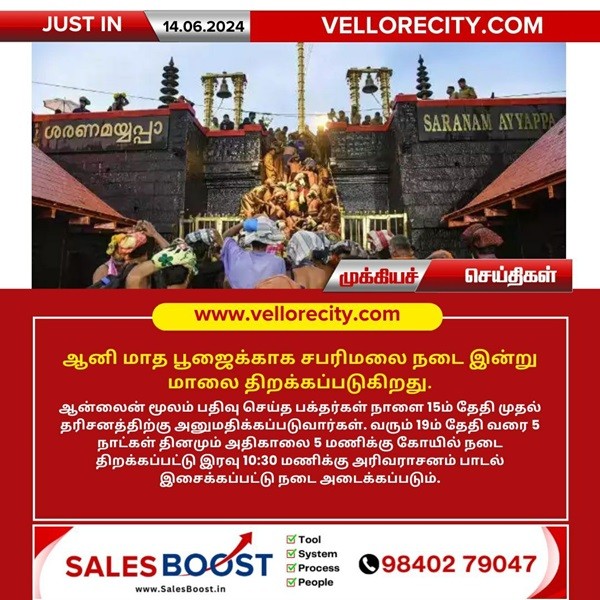 ஆனி மாத பூஜைக்காக சபரிமலை நடை இன்று மாலை திறக்கப்படுகிறது.ஆன்லைன் மூலம் பதிவு செய்த பக்தர்கள் நாளை 15ம் தேதி முதல் தரிசனத்திற்கு அனுமதிக்கப்படுவார்கள். வரும் 19ம் தேதி வரை 5 நாட்கள் தினமும் அதிகாலை 5 மணிக்கு கோயில் நடை திறக்கப்பட்டு இரவு 10:30 மணிக்கு அரிவராசனம் பாடல் இசைக்கப்பட்டு நடை அடைக்கப்படும்.