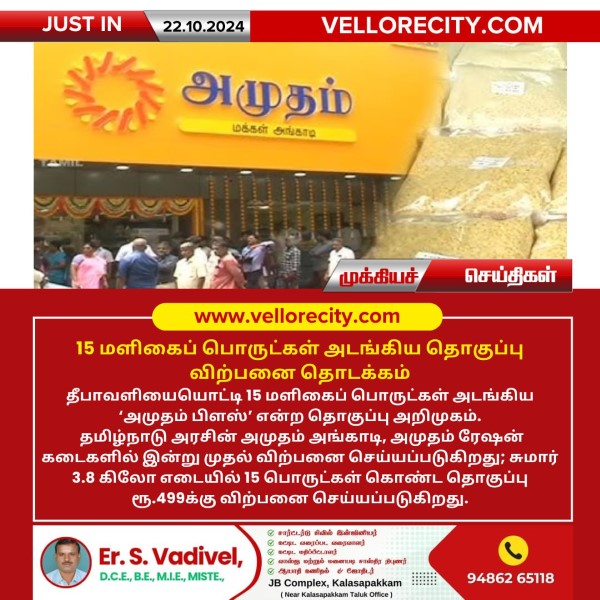 தீபாவளியையொட்டி 15 மளிகைப் பொருட்கள் அடங்கிய ‘அமுதம் பிளஸ்’ என்ற தொகுப்பு அறிமுகம். தமிழ்நாடு அரசின் அமுதம் அங்காடி, அமுதம் ரேஷன் கடைகளில் இன்று முதல் விற்பனை செய்யப்படுகிறது; சுமார் 3.8 கிலோ எடையில் 15 பொருட்கள் கொண்ட தொகுப்பு ரூ.499க்கு விற்பனை செய்யப்படுகிறது.