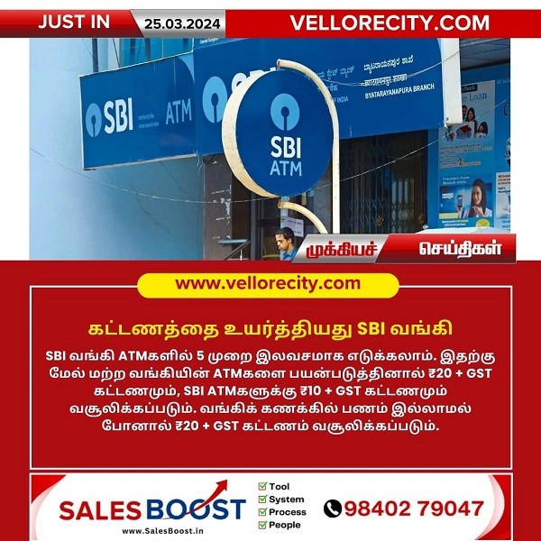 SBI வங்கி ATMகளில் 5 முறை இலவசமாக எடுக்கலாம். இதற்கு மேல் மற்ற வங்கியின் ATMகளை பயன்படுத்தினால் ₹20 + GST கட்டணமும், SBI ATMகளுக்கு ₹10 + GST கட்டணமும் வசூலிக்கப்படும். வங்கிக் கணக்கில் பணம் இல்லாமல் போனால் ₹20 + GST கட்டணம் வசூலிக்கப்படும்.