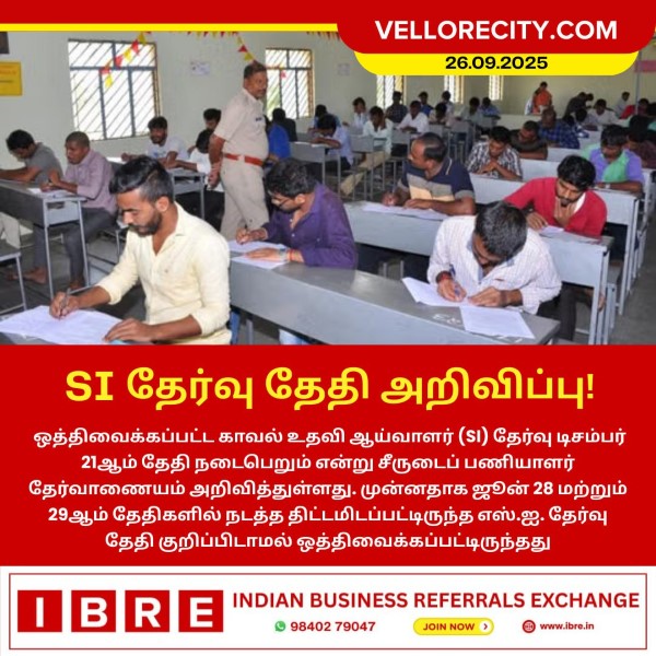 ஒத்திவைக்கப்பட்ட காவல் உதவி ஆய்வாளர் (SI) தேர்வு டிசம்பர் 21ஆம் தேதி நடைபெறும் என்று சீருடைப் பணியாளர் தேர்வாணையம் அறிவித்துள்ளது. முன்னதாக ஜூன் 28 மற்றும் 29ஆம் தேதிகளில் நடத்த திட்டமிடப்பட்டிருந்த எஸ்.ஐ. தேர்வு தேதி குறிப்பிடாமல் ஒத்திவைக்கப்பட்டிருந்தது.