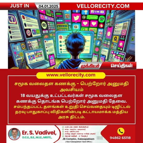 18 வயதுக்கு உட்பட்டவர்கள் சமூக வலைதள கணக்கு தொடங்க பெற்றோர் அனுமதி தேவை. சம்பந்தப்பட்ட தளங்கள் உறுதி செய்வதையும் டிஜிட்டல் தரவு பாதுகாப்பு விதிகளின்படி கட்டாயமாக்க மத்திய அரசு திட்டம். 422