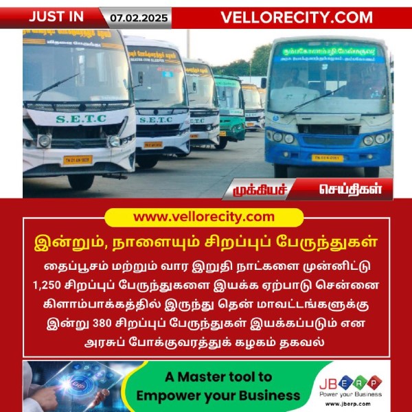 இன்றும், நாளையும் சிறப்புப் பேருந்துகள் தைப்பூசம் மற்றும் வார இறுதி நாட்களை முன்னிட்டு 1,250 சிறப்புப் பேருந்துகளை இயக்க ஏற்பாடு சென்னை கிளாம்பாக்கத்தில் இருந்து தென் மாவட்டங்களுக்கு இன்று 380 சிறப்புப் பேருந்துகள் இயக்கப்படும் என அரசுப் போக்குவரத்துக் கழகம் தகவல் தெரிவித்துள்ளது.