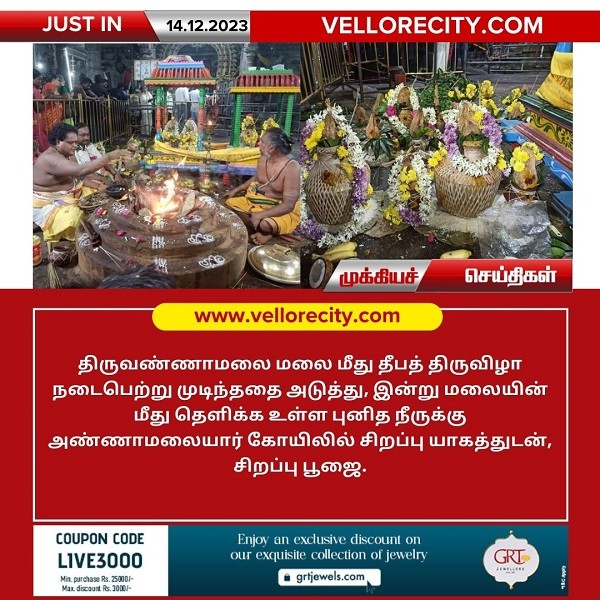 திருவண்ணாமலை மகா தீப மலையில் தெளிக்க உள்ள புனித நீருக்கு அண்ணாமலையார் கோயிலில் சிறப்பு பூஜை!