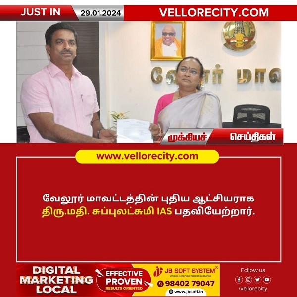 வேலூர் மாவட்ட ஆட்சியராக திருமதி. சுப்புலட்சுமி IAS அவர்கள் புதிய ஆட்சியராக பதவி ஏற்றுக் கொண்டார். 670