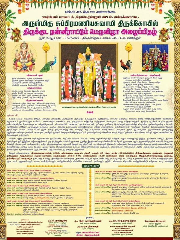காஞ்சிபுரம் மாவட்டம், திருப்பெரும்புதூர் வட்டம், வல்லக்கோட்டை, அருள்மிகு சுப்பிரமணிய சுவாமி திருக்கோயில் திருக்குட நன்னீராட்டுப் பெருவிழா ஆனி 23ஆம் நாள் – 07.07 2025 – திங்கள்கிழமை, காலை 9.00-10.30 மணிக்குள் நடைபெறவுள்ளது.