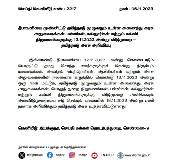 In light of Diwali falling on a Sunday, the Tamil Nadu government has officially declared November 13 as an additional holiday. This decision aims to accommodate the needs of thousands of government employees and students in Chennai who frequently travel to their hometowns on Fridays and return on Sundays.