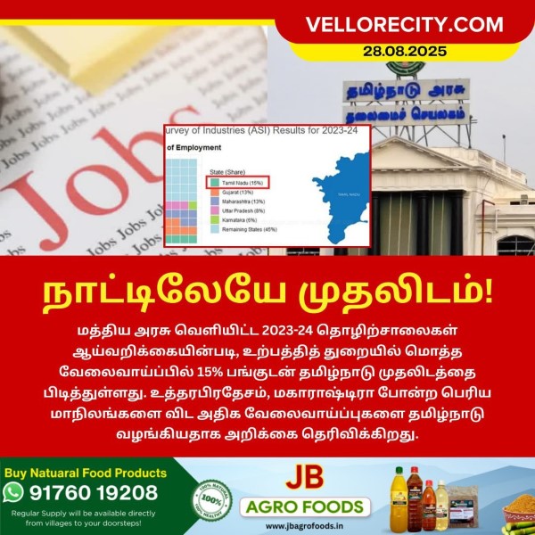 மத்திய அரசு வெளியிட்ட 2023-24 தொழிற்சாலைகள் ஆய்வறிக்கையின்படி, உற்பத்தித் துறையில் மொத்த வேலைவாய்ப்பில் 15% பங்குடன் தமிழ்நாடு முதலிடத்தை பிடித்துள்ளது. உத்தரபிரதேசம், மகாராஷ்டிரா போன்ற பெரிய மாநிலங்களை விட அதிக வேலைவாய்ப்புகளை தமிழ்நாடு வழங்கியதாக அறிக்கை தெரிவிக்கிறது.