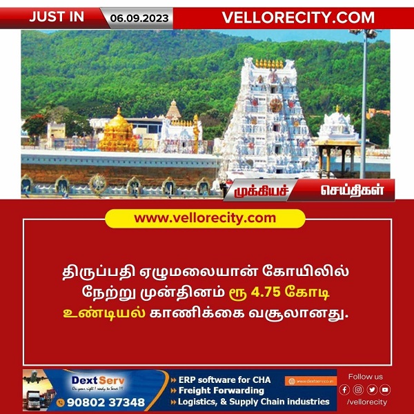 திருமலை திருப்பதி ஏழுமலையான் கோவிலில் நேற்று முன்தினம் 4.75 கோடி ரூபாயை பக்தர்கள் காணிக்கையாக செலுத்தியுள்ளனர்.