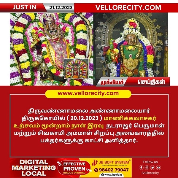 திருவண்ணாமலை அண்ணாமலையார் திருக்கோயில் நேற்று (20.12.2023) மாணிக்கவாசகர் உற்சவம் மூன்றாம் நாள் இரவு நடராஜர் பெருமாள் மற்றும் சிவகாமி அம்மாள் சிறப்பு அலங்காரத்தில் பக்தர்களுக்கு காட்சி அளித்தார்.