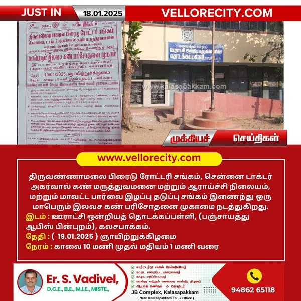 திருவண்ணாமலை பிரைடு ரோட்டரி சங்கம், சென்னை டாக்டர் அகர்வால் கண் மருத்துவமனை மற்றும் ஆராய்ச்சி நிலையம், மற்றும் மாவட்ட பார்வை இழப்பு தடுப்பு சங்கம் இணைந்து ஒரு மாபெரும் இலவச கண் பரிசோதனை முகாமை நடத்துகிறது.