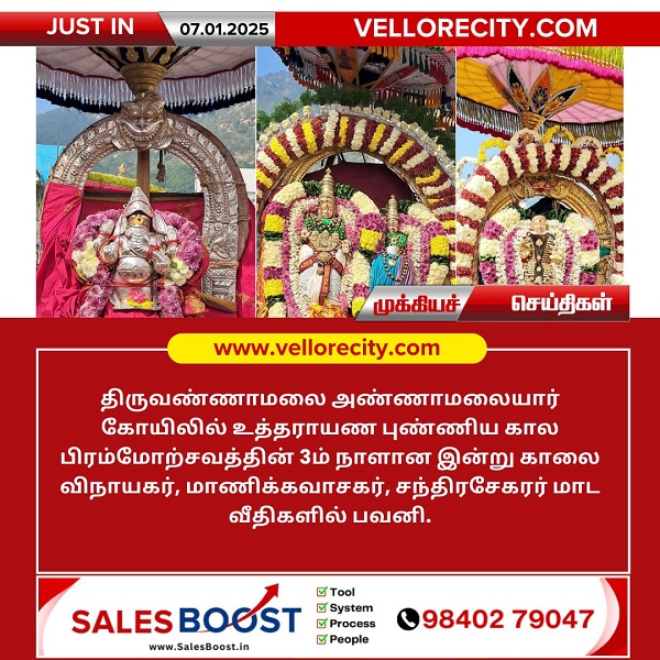 திருவண்ணாமலை அண்ணாமலையார் கோயிலில் உத்தராயண புண்ணிய கால பிரம்மோற்சவத்தின் 3ம் நாளான இன்று காலை விநாயகர், மாணிக்கவாசகர், சந்திரசேகரர் மாட வீதிகளில் பவனி. 410