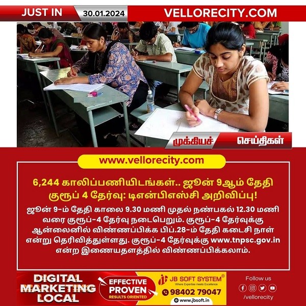 தமிழ்நாடு அரசு பணியாளர் தேர்வாணையம் 2024 – ஆம் ஆண்டு நடக்க இருக்கும் குரூப்4 தேர்வுக்கான விண்ணப்பம் இன்று (30.01.2024) வெளியிட்டது. ஜூன் 9-ம் தேதி காலை 9.30 மணி முதல் நண்பகல் 12.30 மணி வரை தேர்வு நடைபெறும். ஆன்லைனில் விண்ணப்பிக்க பிப்.28-ம் தேதி கடைசி நாள் என்று தெரிவித்துள்ளது. www.tnpsc.gov.in என்ற இணையதளத்தின் மூலம் விண்ணப்பிக்கலாம்.