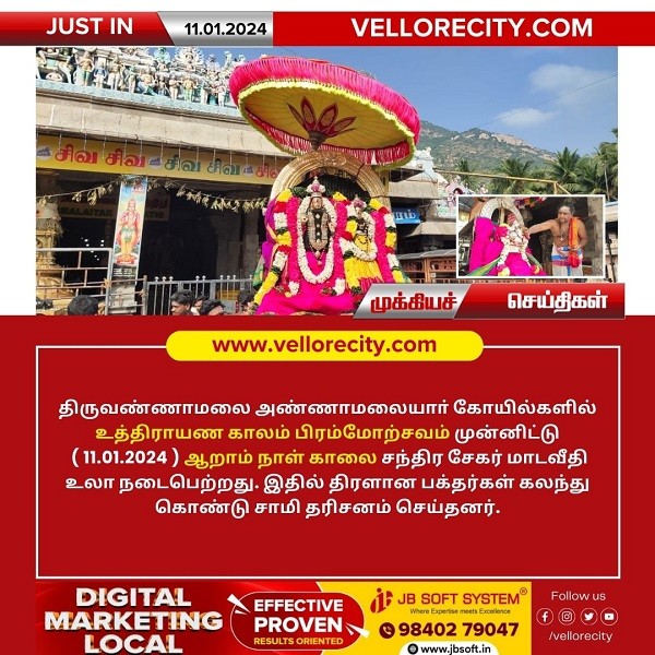 திருவண்ணாமலை அண்ணாமலையார் திருக்கோயிலில் உத்திராயண காலம் பிரம்மோற்சவம் ஆறாம் நாளான இன்று (11.01.2024 ) காலை விநாயகர் மற்றும் சந்திரசேகரர் உற்சவம் நடைபெற்றது. இதில் திரளான பக்தர்கள் கலந்து கொண்டு சாமி தரிசனம் செய்தனர்.
