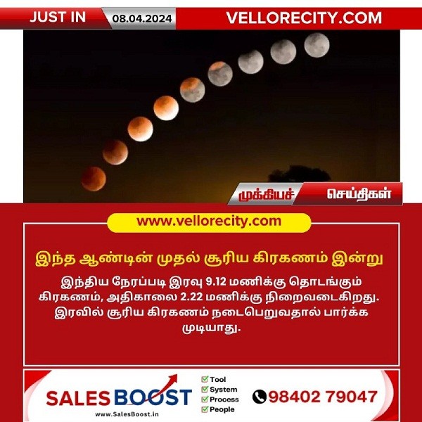 இந்திய நேரப்படி இரவு 09:12 மணிக்கு தொடங்கி கிரகணம், அதிகாலை 02:22 மணிக்கு நிறைவடைகிறது. இரவில் சூரிய கிரகணம் நடைபெறுவதால் பார்க்க முடியாது.