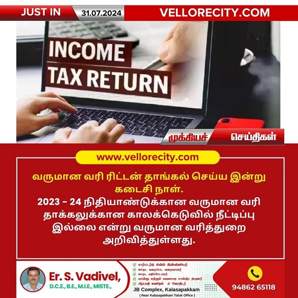 2023 – 24 நிதியாண்டுக்கான வருமான வரி தாக்கலுக்கான காலக்கெடுவில் நீட்டிப்பு இல்லை என்று வருமான வரித்துறை அறிவித்துள்ளது.
