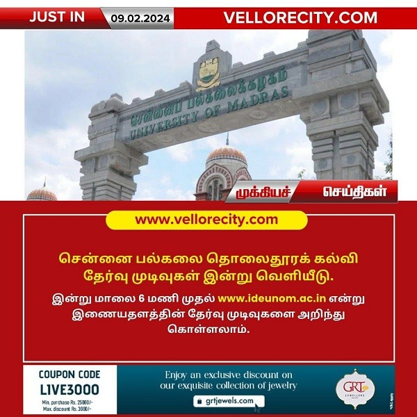 சென்னை பல்கலை தொலைதூரக் கல்வி தேர்வு முடிவுகள் இன்று வெளியீடு. இன்று (09.02.2024) மாலை 6 மணி முதல் www.ideunom.ac.in என்ற இணையதளத்தில் தேர்வு முடிவுகளை அறிந்து கொள்ளலாம்.