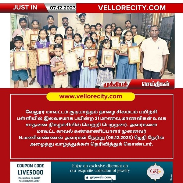 வேலூர் மாவட்டம் குடியாத்தம் தாழை சிலம்பம் பயிற்சி பள்ளியில் இலவசமாக பயின்ற 21 மாணவ, மாணவிகள் உலக சாதனை நிகழ்ச்சியில் வெற்றி பெற்றனர். அவர்களை மாவட்ட காவல் கண்காணிப்பாளர் முனைவர் N.மணிவண்ணன் அவர்கள் நேற்று (06.12.2023) தேதி நேரில் அழைத்து வாழ்த்துக்கள் தெரிவித்துக் கொண்டார்.