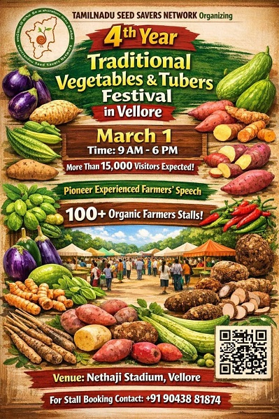 தமிழ்நாடு விதை சேகரிப்பாளர்கள் கூட்டமைப்பு நடத்தும் மாபெரும் காய்கறி மற்றும் ஆண்டு கிழங்கு திருவிழா – 2026 வரும் 01 மார்ச் 2026 (ஞாயிற்றுக்கிழமை) அன்று காலை 09.00 மணி முதல் மாலை 05.00 மணி வரை நடைபெறும் இந்த விழாவில் 1000-க்கு மேற்பட்ட மரபு காய்கறி மற்றும் ஆண்டு கிழங்கு வகைகள் கண்காட்சி மற்றும் விற்பனைக்கு வைக்கப்படுகின்றன. இந்நிகழ்ச்சிக்கு அனுமதி இலவசம் என அறிவிக்கப்பட்டுள்ளது.