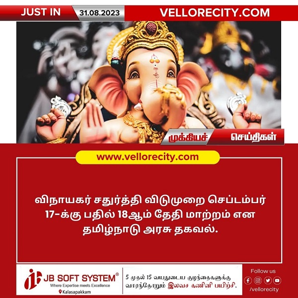 விநாயகர் சதுர்த்தி விடுமுறை தேதி செப்டம்பர் 17-ஆம் நாள் அறிவிக்கப்பட்டிருந்த நிலையில் தற்போது மாற்றம் செய்யப்பட்டு செப்டம்பர் 18 – ஆம் தேதி (திங்கட்கிழமை) விடுமுறை நாளாக தமிழ்நாடு அரசு அறிவித்துள்ளது.