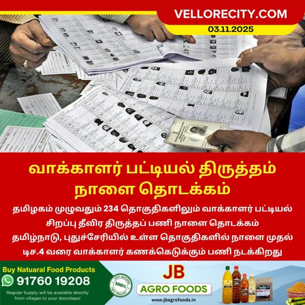 தமிழகம் முழுவதும் 234 தொகுதிகளிலும் வாக்காளர் பட்டியல் சிறப்பு தீவிர திருத்தப் பணி நாளை தொடக்கம் தமிழ்நாடு, புதுச்சேரியில் உள்ள தொகுதிகளில் நாளை முதல் டிச.4 வரை வாக்காளர் கணக்கெடுக்கும் பணி நடக்கிறது.