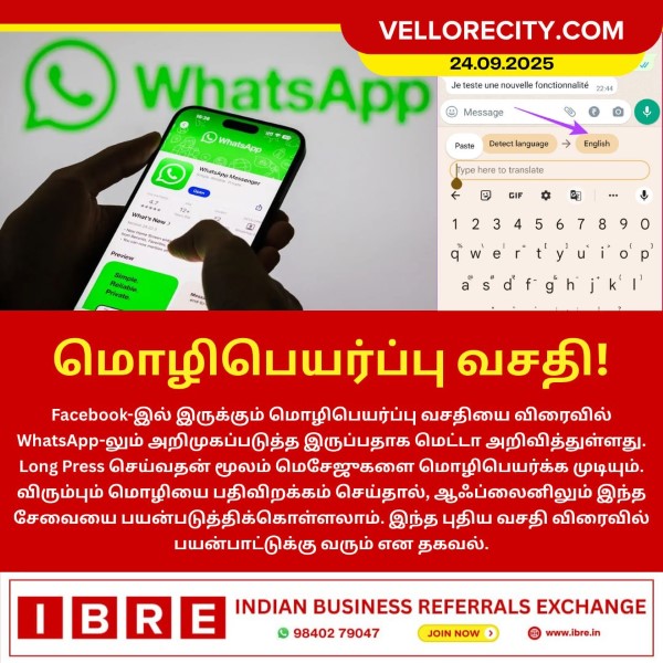 Facebook-இல் இருக்கும் மொழிபெயர்ப்பு வசதியை விரைவில் WhatsApp-லும் அறிமுகப்படுத்த இருப்பதாக மெட்டா அறிவித்துள்ளது. Long Press செய்வதன் மூலம் மெசேஜுகளை மொழிபெயர்க்க முடியும். விரும்பும் மொழியை பதிவிறக்கம் செய்தால், ஆஃப்லைனிலும் இந்த சேவையை பயன்படுத்திக்கொள்ளலாம். இந்த புதிய வசதி விரைவில் பயன்பாட்டுக்கு வரும் என தகவல்.