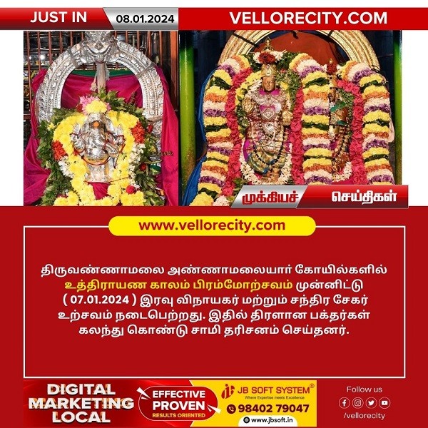திருவண்ணாமலை அண்ணாமலையார் திருக்கோயிலில் உத்திராயண புண்ணியகால பிரம்மோற்சவம் முன்னிட்டு நேற்று (07.01.2024) இரவு விநாயகர் மற்றும் சந்திர சேகரர் உற்சவம் நடைபெற்றது. இதில் திரளான பக்தர்கள் கலந்து கொண்டு சாமி தரிசனம் செய்தனர்.