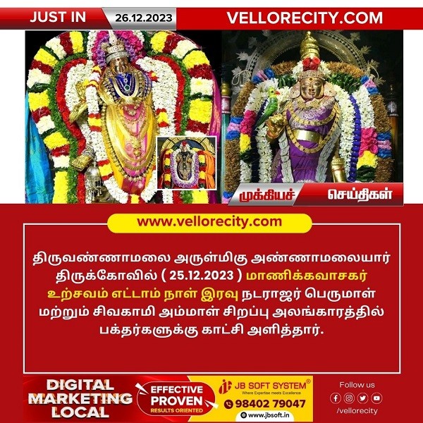 திருவண்ணாமலை அருள்மிகு அண்ணாமலையார் திருக்கோவில் (25.12.2023) மாணிக்கவாசகர் உற்சவம் எட்டாம் நாள் இரவு நடராஜர் பெருமாள் மற்றும் சிவகாமி அம்மாள் சிறப்பு அலங்காரத்தில் பக்தர்களுக்கு காட்சி அளித்தார்.
